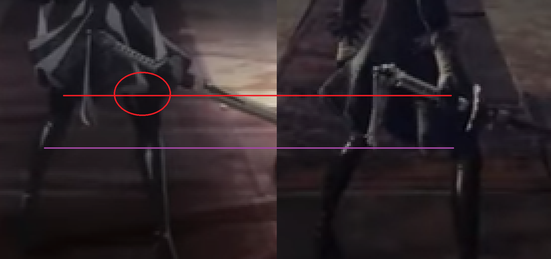 Заметно, что платье 2B в аниме (слева) гораздо короче игрового (справа), обнажает ноги.