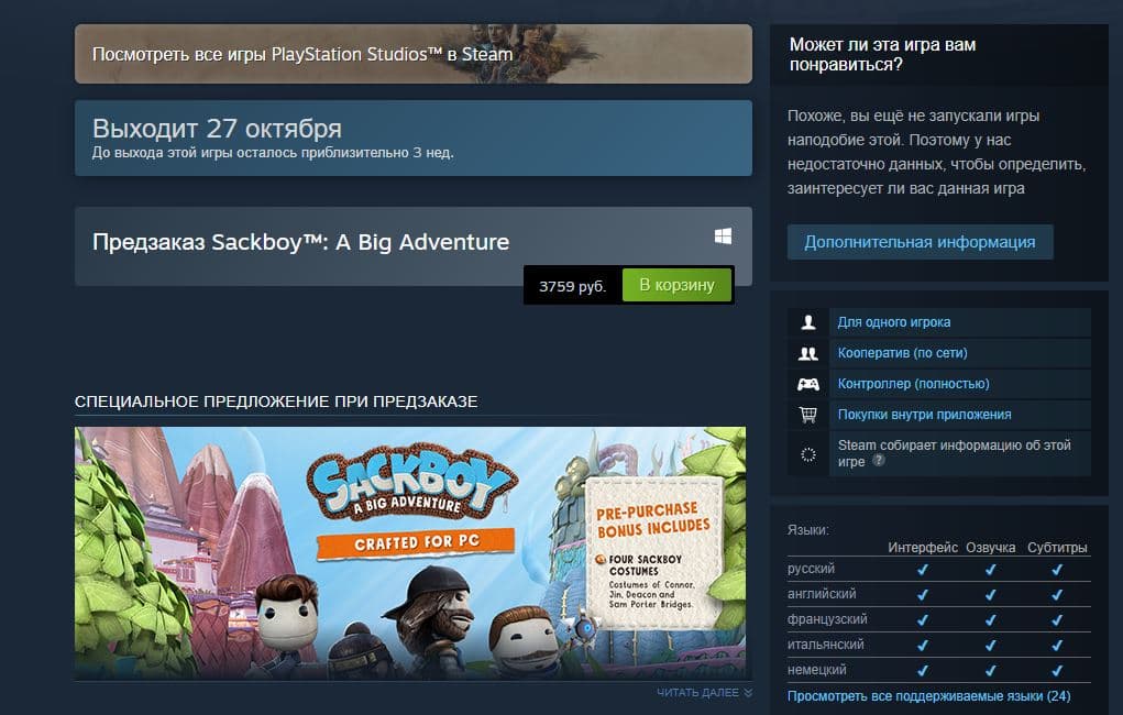 Sony Interactive Entertainment и студия Sumo Digital выпустили трейлер ПК-версии Sackboy: A Big Adventure и начала принимать предварительные заказы на платформер в Steam и Epic Games Store. Цена — 3 759 рублей.