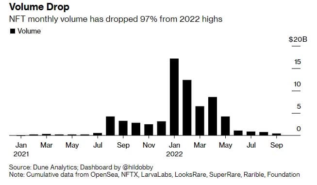 Спустя несколько месяцев NFT перестала быть одной из самых обсуждаемых тем, и, ожидается, что оборот токенов в сентябре составит всего 466,9 млн долларов США. Bloomberg сообщает о падении на 97%.