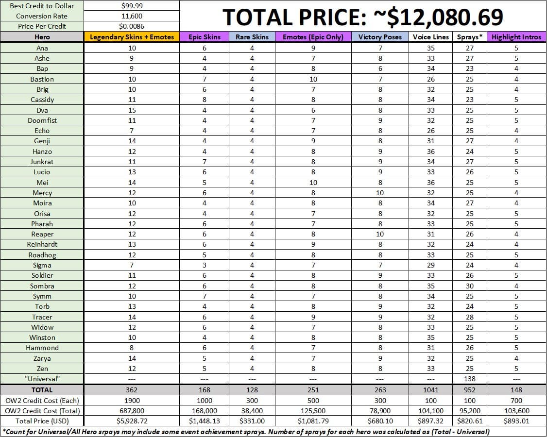 Пользователь сообщества Overwatch на Reddit посчитал во сколько обойдётся разблокировка всех предметов в игре для новых игроков. Если бы пользователь захотел приобрести все косметические предметы для пула героев Overwatch 1 в Overwatch 2, это обошлось бы примерно в 12 000 долларов.