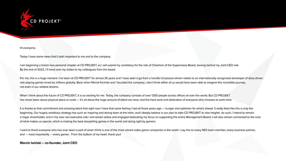 Основатель CD Projekt Марчин Ивински (Marcin Iwiński) опубликовал открытое письмо. Он принял решение покинуть пост директора.