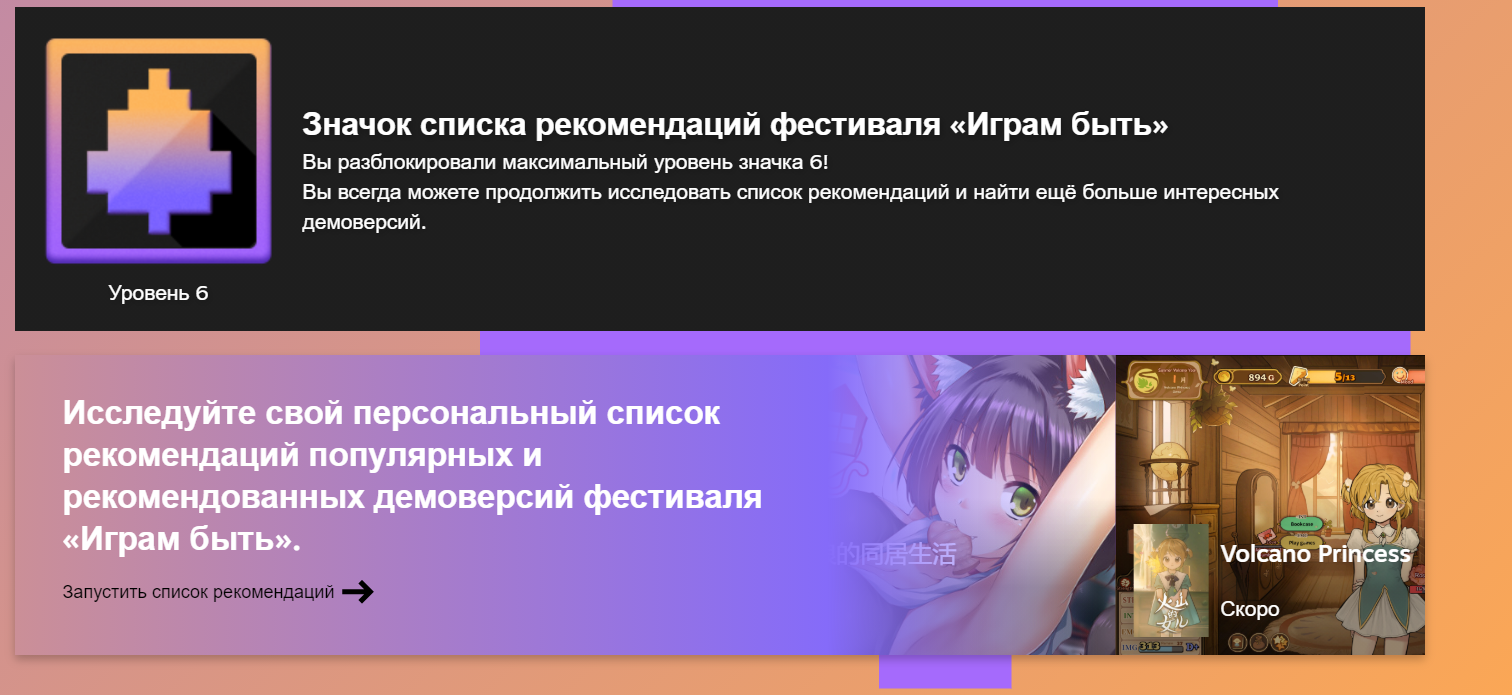 В прошлый раз получение значка требовало запускать демоверсии, но сейчас достаточно ознакомиться со списком рекомендаций на специальной странице Steam Next Fest. Значок можно улучшить до 6 уровня.