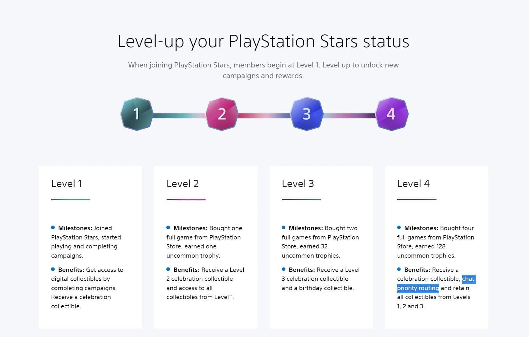 Сама программа разделена на четыре уровня. Все новые члены начинают с первого, а затем могут расти, покупая игры в PlayStation Store и зарабатывая трофеи.