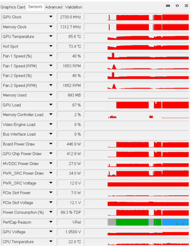 Пока неизвестно, чем была нагружена видеокарта NVIDIA GeForce RTX 4090. Представленные показатели, судя по всему, взяты после снятия нагрузки (GPU Load = 0, на первом скриншоте 97%).