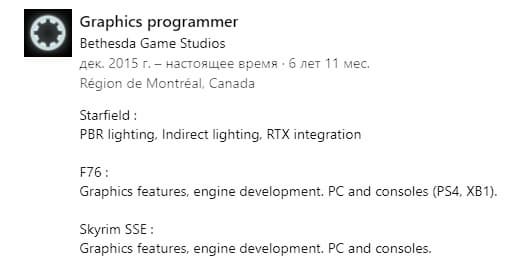 Упоминание о технологии трассировки лучей замечено в профиле графического программиста, проработавшего в Bethesda Games Studios более шести лет. Среди проектов, которые он упоминает, - «интеграция RTX».