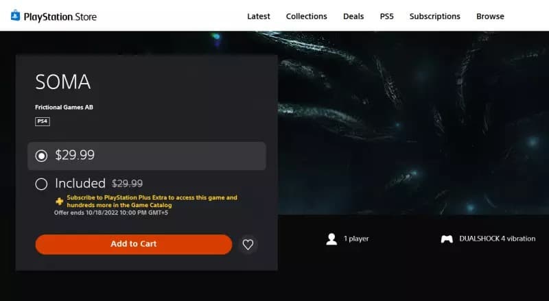До сих пор версия SOMA для PS4 (работающая на PS5 с помощью обратной совместимости) была доступна в подписке бесплатно. 18 октября 2022 года её уберут.