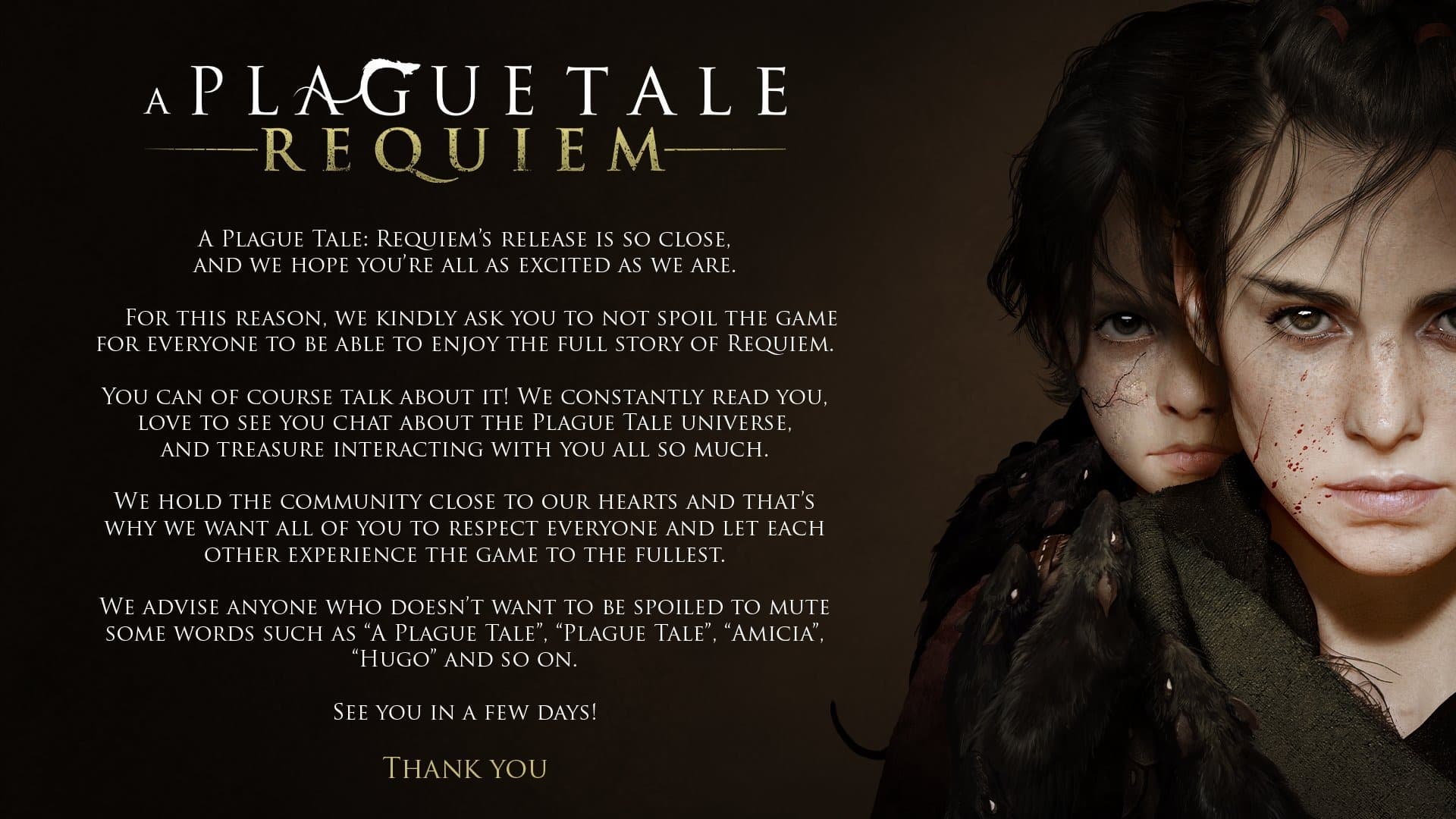 «Мы заботимся о нашем сообществе, поэтому хотим, чтобы все уважали друг друга и позволяли друг другу в полной мере ощутить игру. Советуем всем, кто не хочет испортить себе удовольствие, игнорировать в Интернете словосочетания “A Plague Tale”, “Plague Tale”, “Amicia”, “Hugo” и так далее».