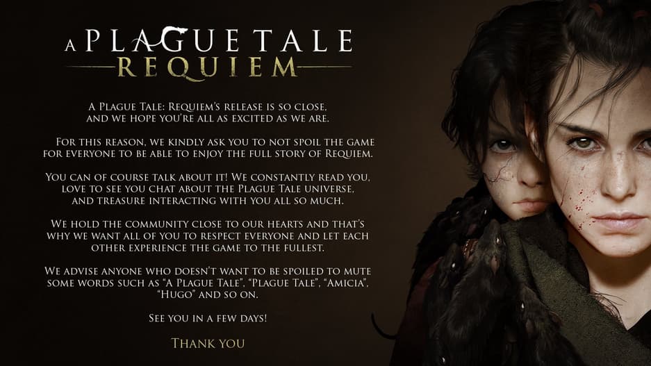 «Релиз A Plague Tale: Requiem близок, и мы надеемся, что вы так же рады, как и мы. Поэтому убедительно просим не портить игру другим, чтобы все могли в полной мере насладиться её сюжетом».