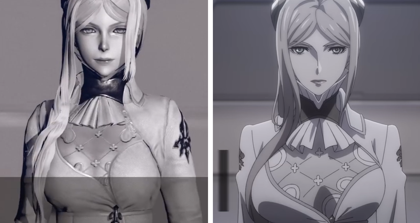 Сцена с Commander White в игре NieR Automata, фрагмент начинается с 48 секунды и с 1:07.
