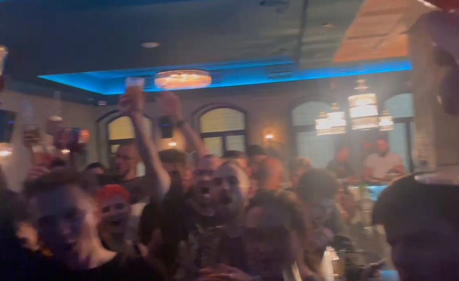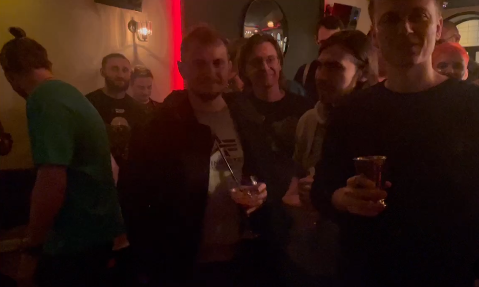 В кадре много людей, которые что-то пьют из бокалов, бутылок и не только. Автор ролика призывает компанию немного дружно покричать. На его призыв откликаются.