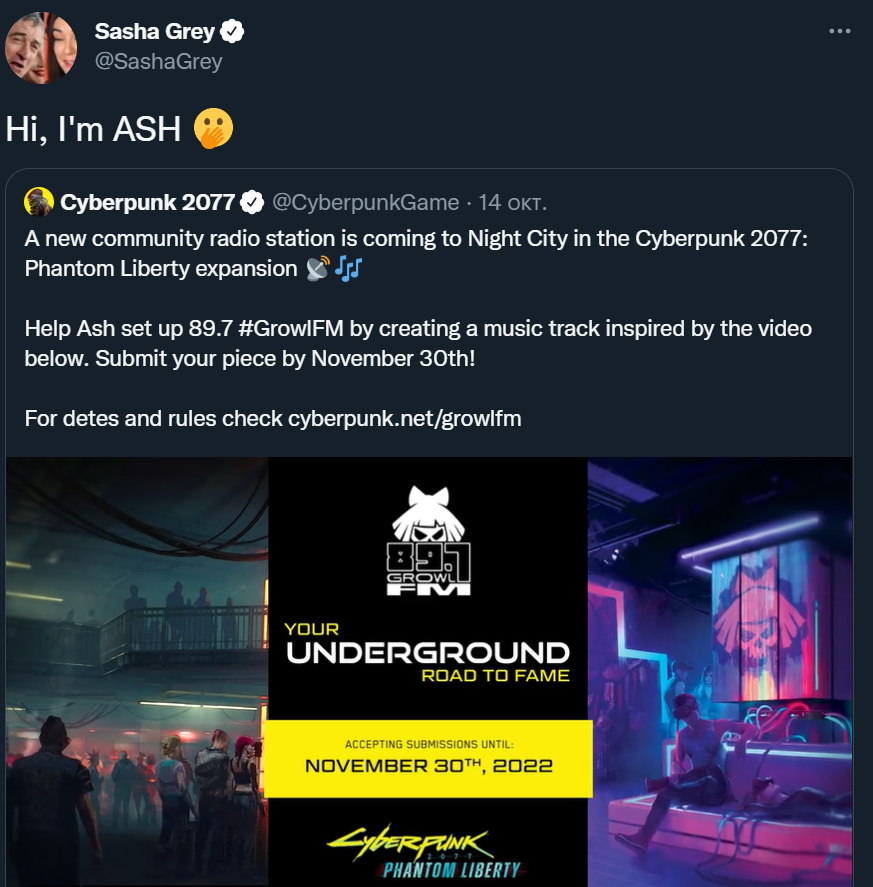 Фанатам предложили написать музыку, которая может затем появиться в игре на новой радиостанции в дополнении Phantom Liberty. В посте упоминается Ash (Эш), которым (гендер не уточнили) надо помочь создать радиостанцию Growl FM