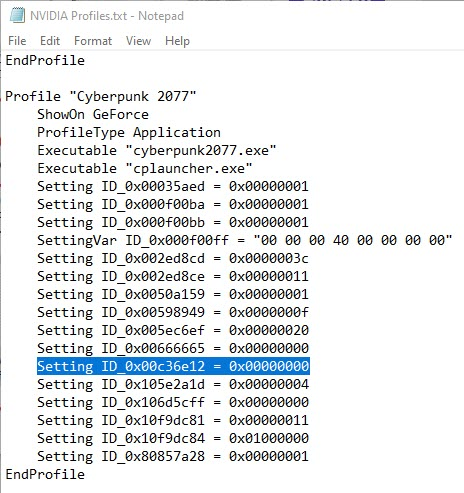 Затем открыть его с помощью текстового редактора и отыскать раздел с «Cyberpunk». Здесь необходимо добавить строку следующего содержания: «Setting ID_0x00c36e12 = 0x00000000», пример представлен ниже.