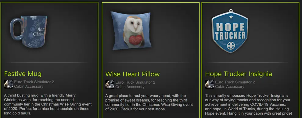 Порой SCS Software во время менее значимых, по сравнению с 10 днём рождения ETS 2, событий предлагала более интересные награды. Например, ранее можно было получить украшения для кабины: чашку, подушку и различные брелки.