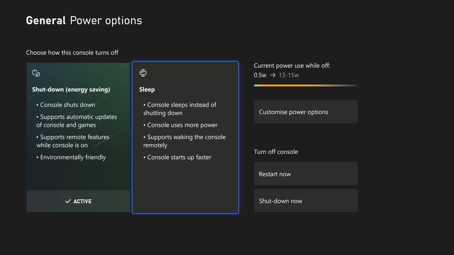 Microsoft позаботилась о некоторых улучшениях в меню Xbox, в частности, во вкладке опций питания, созданы новые пункты «Shut-Down» (от «Energy Saver») и «Sleep» (от «Standby»). Кроме того, теперь точно показывается, сколько энергии потребляет консоль в каждом режиме, чтобы игроки могли легко оценить, какое из предложений лучше выбрать.