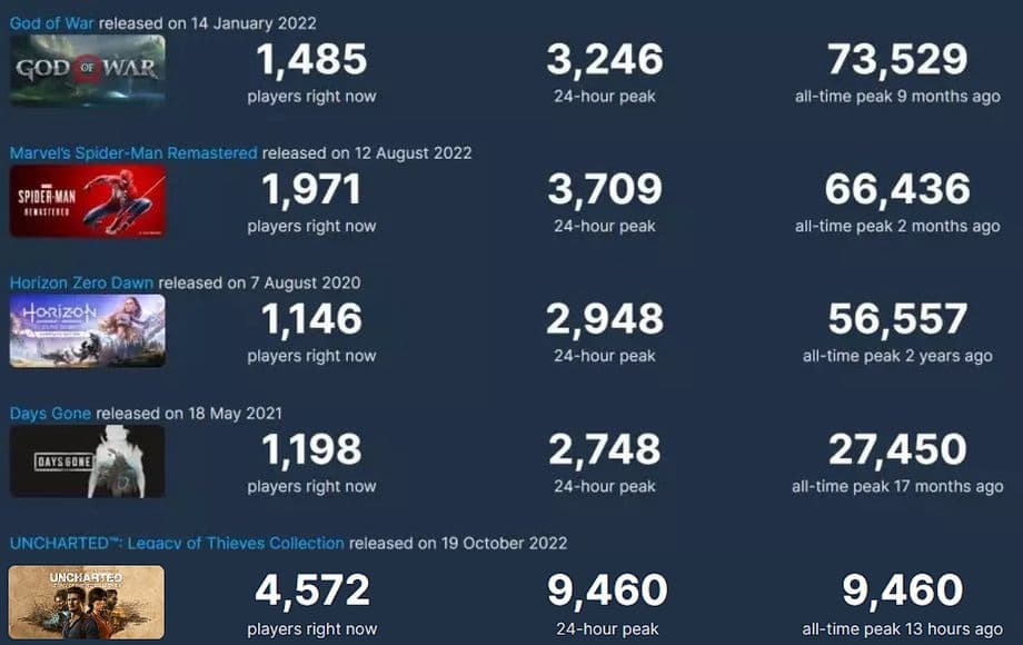 После таких шикарных запусков на ПК, как у Spider-Man Remastered и God of War, Uncharted Collection Legacy of Thieves встречена геймерами с удивительно низким интересом. Можно с уверенностью предположить, что Sony надеялись на гораздо лучший результат.