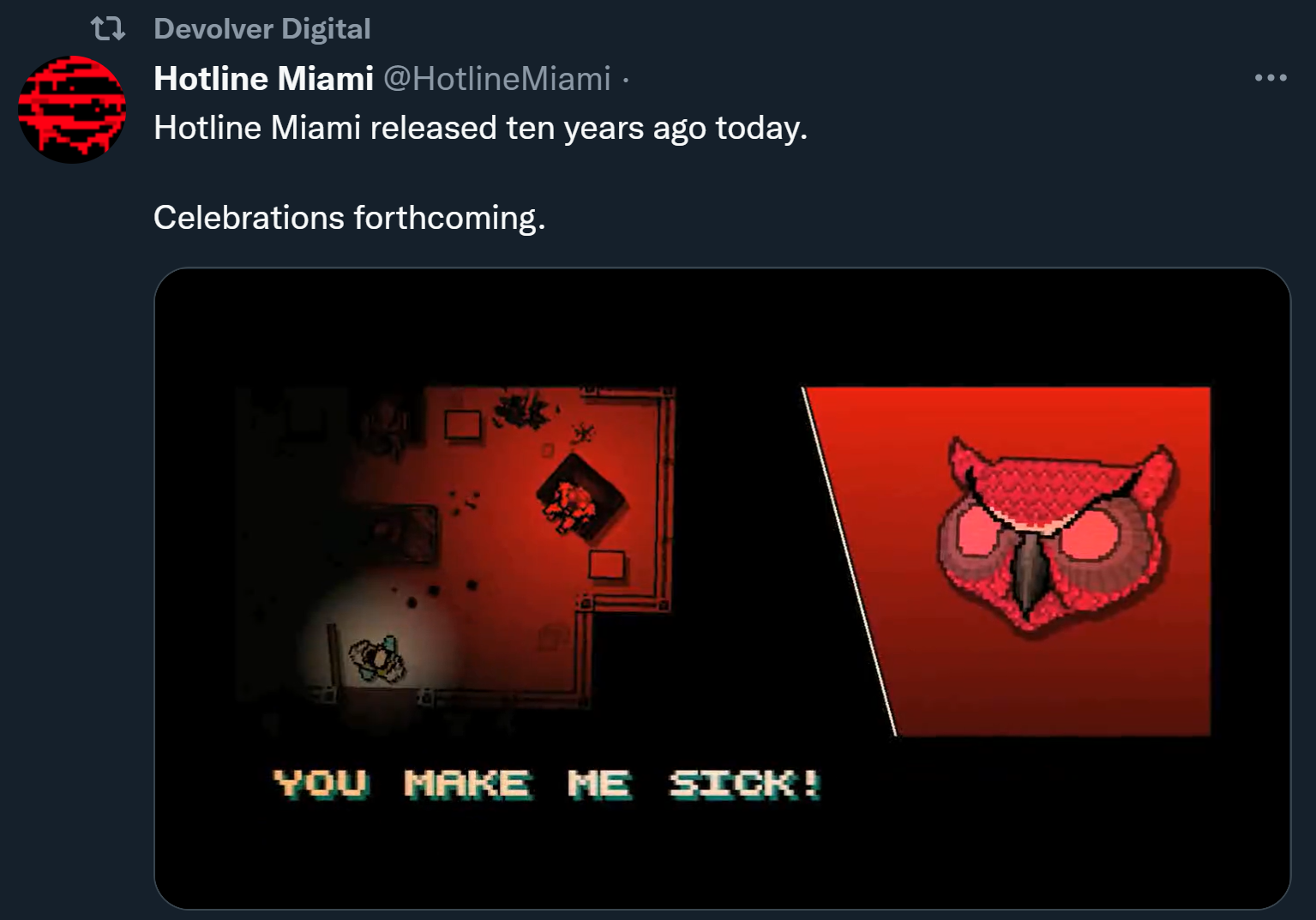 23 октября 2012 года выпустили Hotline Miami. Игру разработала Dennaton Games, которая впоследствии сделала вторую часть.