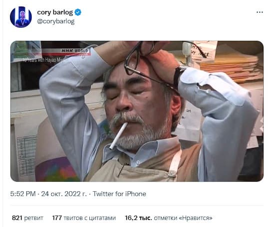 После того, как стало известно об утечке, продюсер Кори Барлог опубликовал в Twitter фотографию японского аниматора Хаяо Миядзаки. Скорее всего, он хочет акцентировать внимание на выражении лица мужчины и таким образом выразить недовольство просочившейся сюжетной линией.