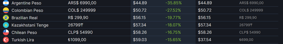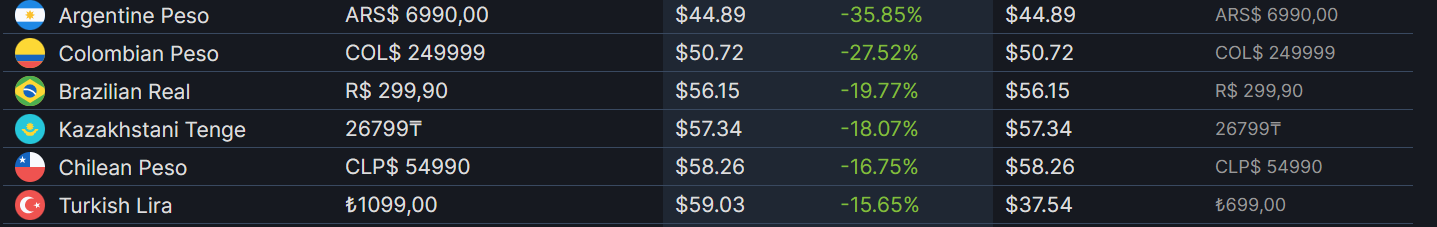 Некоторые игроки переносили аккаунты в Турцию, чтобы воспользоваться довольно низкими (по меркам ряда стран) ценами. Однако, теперь при пересчёте на SteamDB складывается ситуация, когда игроки из Турции отдают примерно эквивалент 59 долларов, а в Казахстане 57 (там цену пока не меняли).
