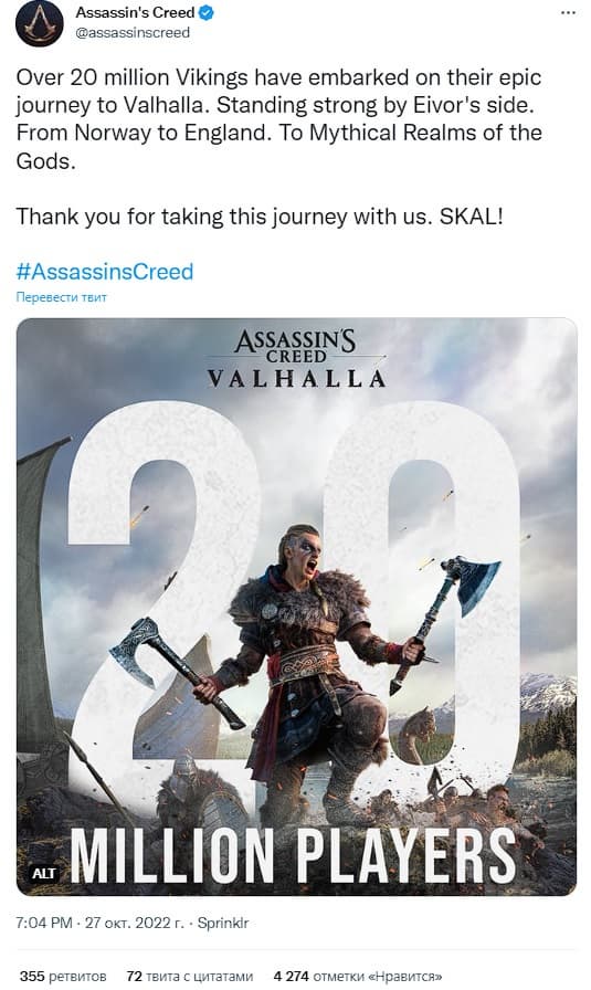 Оказывается, к игре приобщилось более 20 миллионов человек. В сообщении не говорится о проданном количестве копий, возможно, значительное число игроков запускало Valhalla во время бесплатного месяца с подпиской Ubisoft Plus.