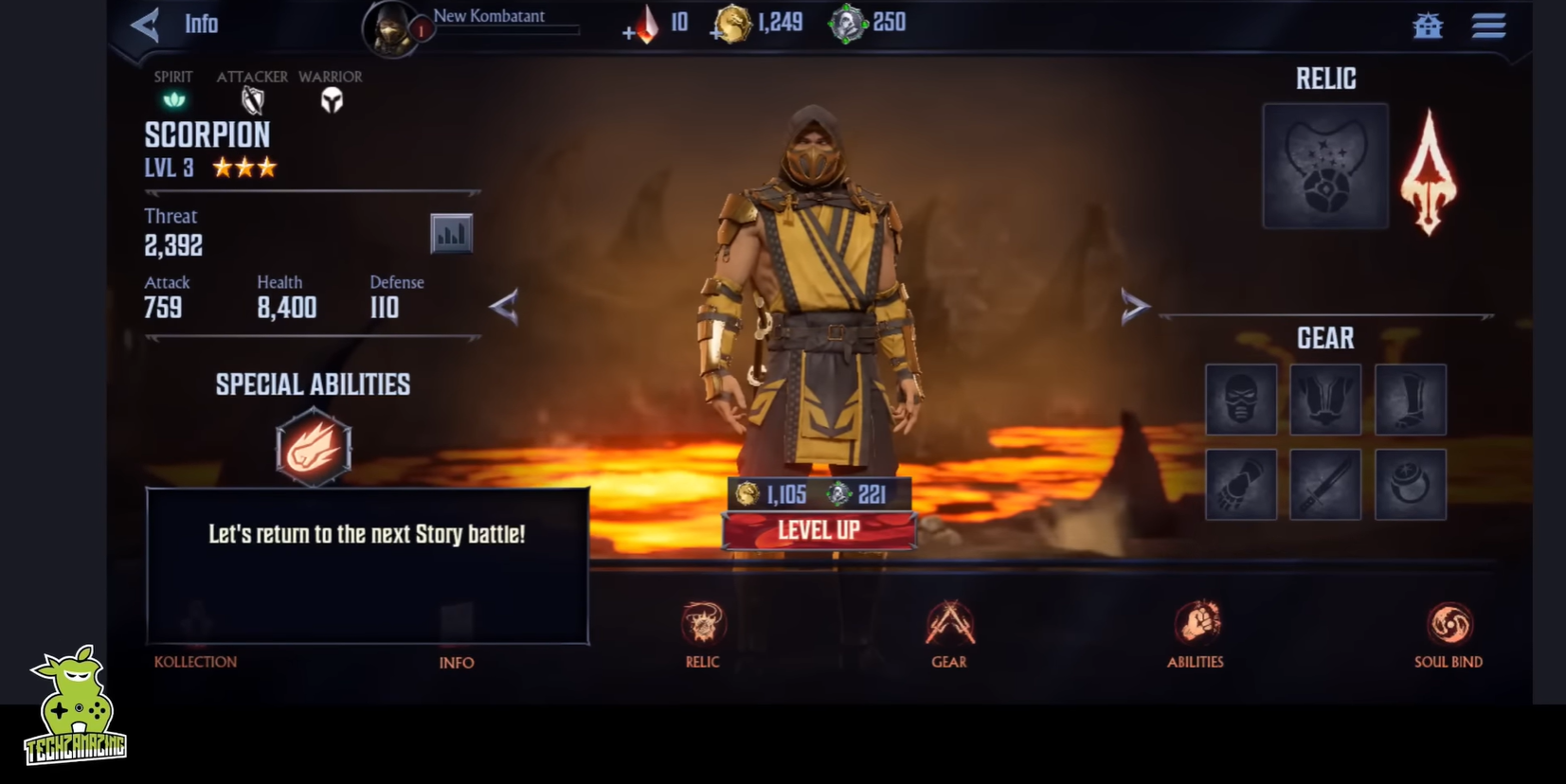 У персонажей есть редкость, например Скорпион удостоился 3 звёздочек редкости. Будет возможность прокачивать уровни. Есть окошки под снаряжение и реликвию, можно заметить несколько видов виртуальной валюты.
