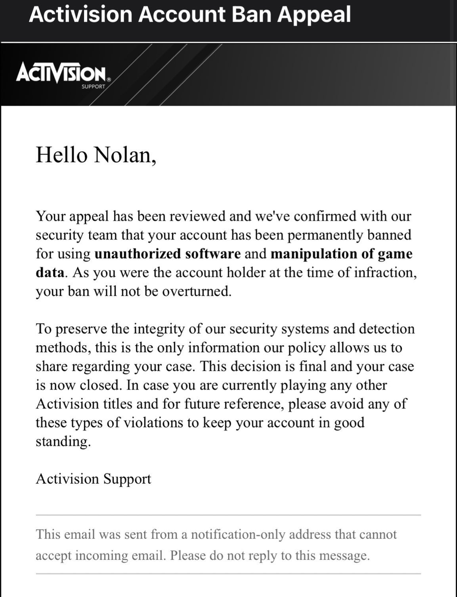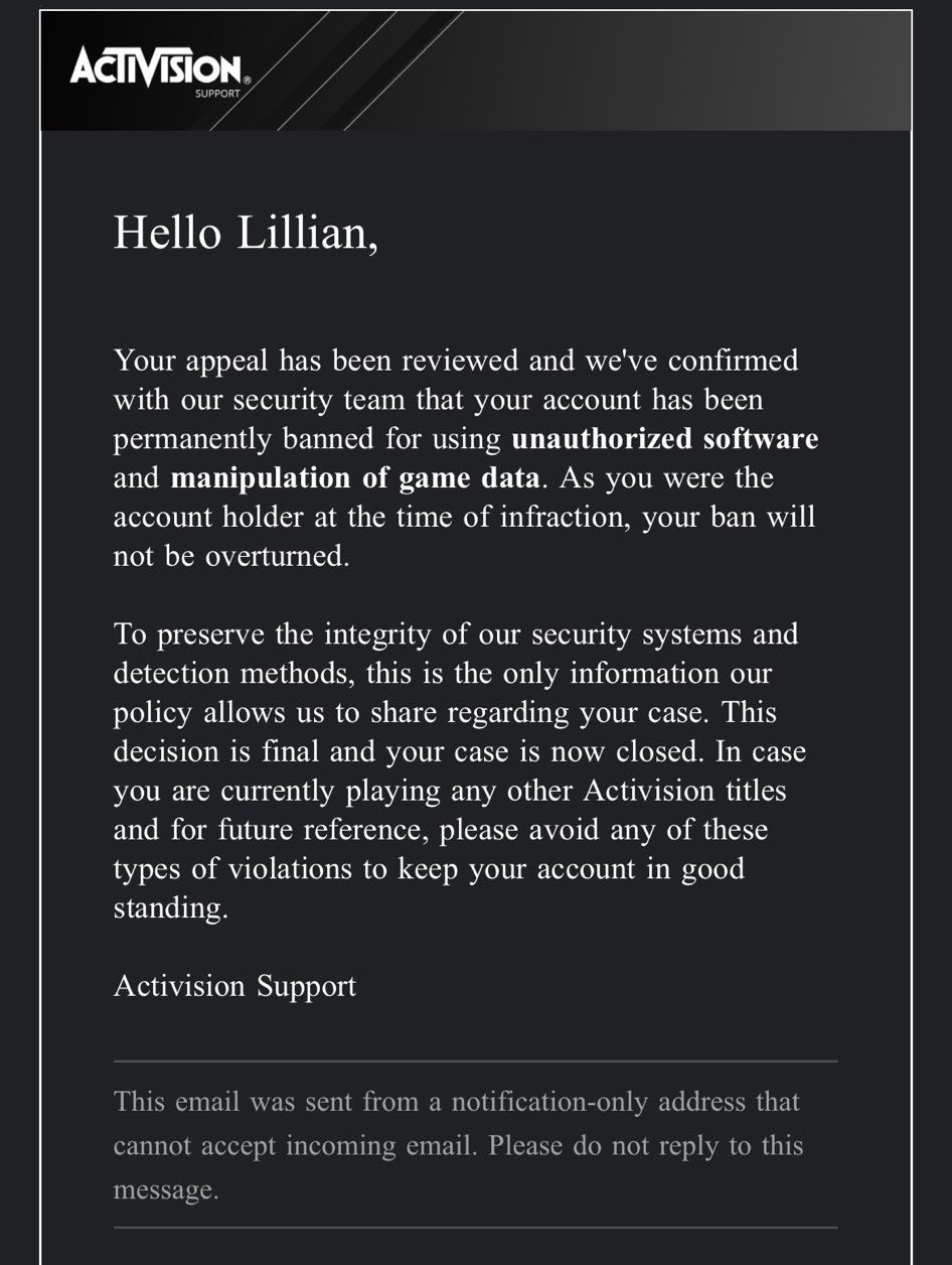 Можно было бы подумать, что предусмотрена возможность оспорить наказание — чтобы разработчики разобрались в ситуации и, возможно, пересмотрели решение. Однако, наказанным игрокам Call of Duty Modern Warfare 2 сообщают, что решение окончательное, т.е. обжалованию не подлежит (хотя некоторые всё же пытаются, пока безуспешно). Игра стоит 70 долларов.