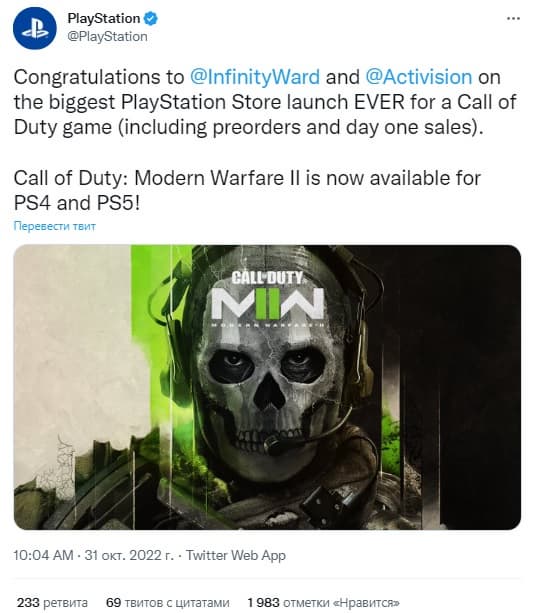 Sony подтвердила, что Call of Duty Modern Warfare 2 стала мегахитом. Игра достигла «крупнейшего в истории PlayStation Store старта Call of Duty», опередив Modern Warfare в 2019 году и Black Ops Cold War в 2020 году.