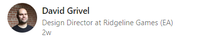 Дэвид Гривель занял в Ridgeline Games пост Design Director, т.е. директор по дизайну. Эта должность схожа с «креативным директором», но упор делается на техническую составляющую.