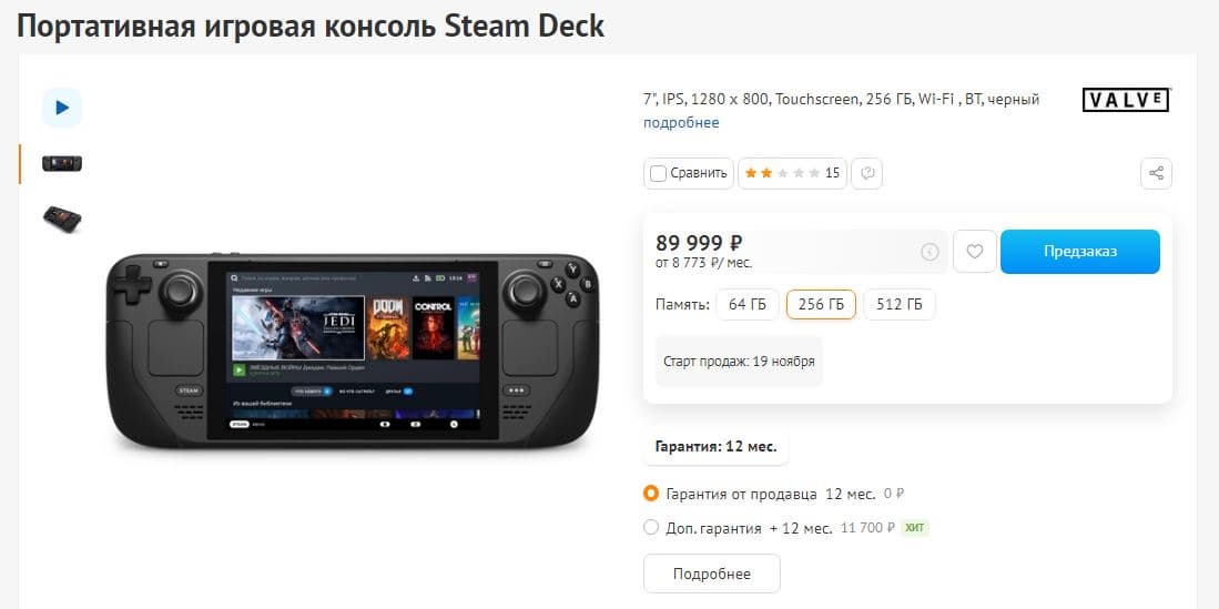 Сеть магазинов по продаже электроники и бытовой техники DNS начала принимать предварительные заказы на Steam Deck c 256 и 512 ГБ памяти на борту за 89 999 и 99 999 рублей соответственно. Сами устройства поступят в продажу 19 ноября.