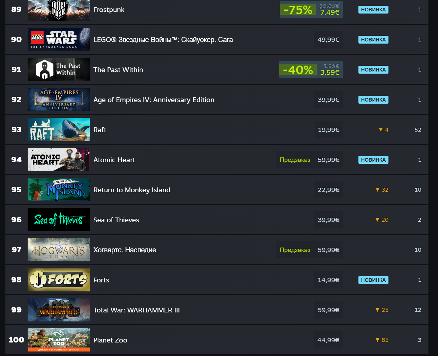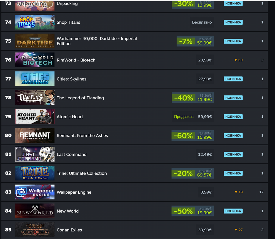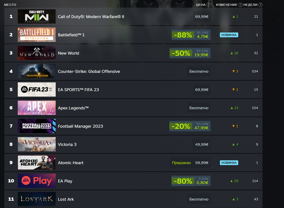 Valve обновила систему чартов продаж в Steam и теперь легко можно посмотреть, что покупают в разных странах мира. Недавно открыли предзаказы Atomic Heart в Steam и игра начала появляться в чартах.