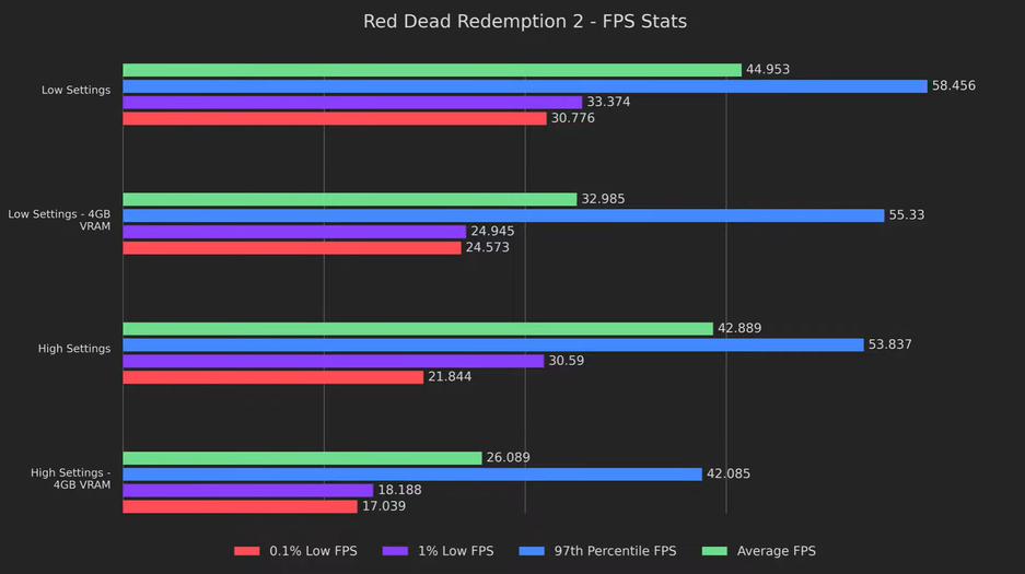 Порой игры наоборот теряют FPS, например такое случилось с Red Dead Redemption 2 (графики с 4GB VRAM).