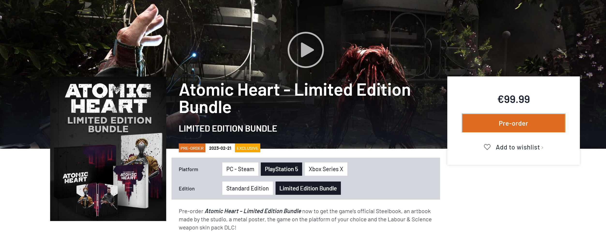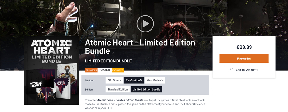 Лимитированное издание Atomic Heart предусмотрено для PlayStation 5, Xbox Series X и для ПК с ключом для Steam. В комплекте постер формата А4 с женоподобной машиной, 262-страничный артбук, стилбук и прилагается коллекционная коробка с лого игры. Стоимость составляет 99.99 евро для всех платформ.