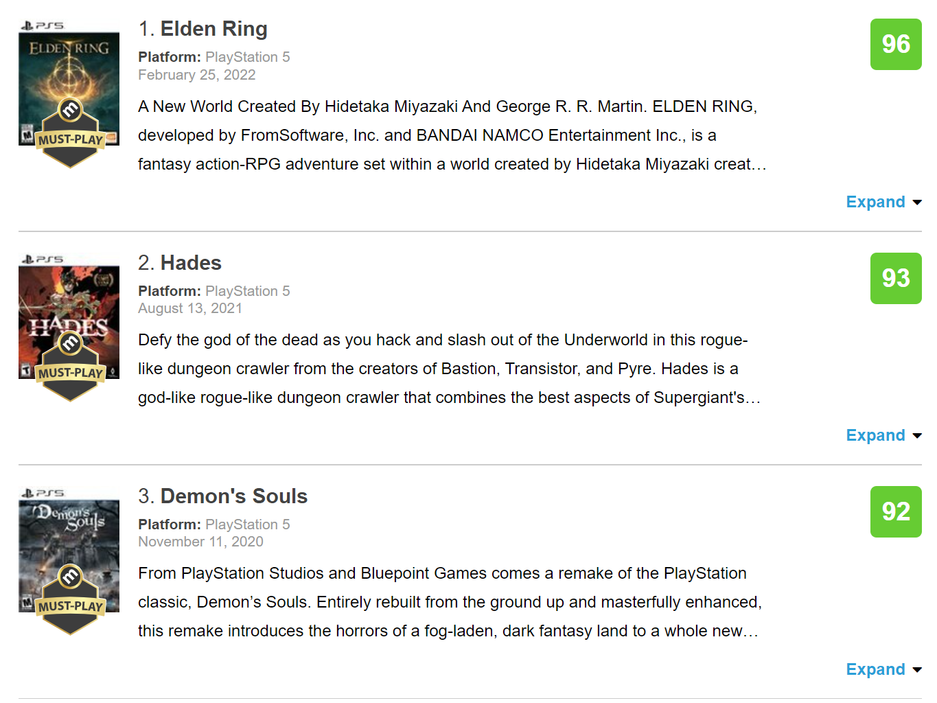 Рейтинг на Metacritic пока не обновили. Получается, что God of War Ragnarok расположилась между Elden Ring с 96 баллами и Hades с 93.