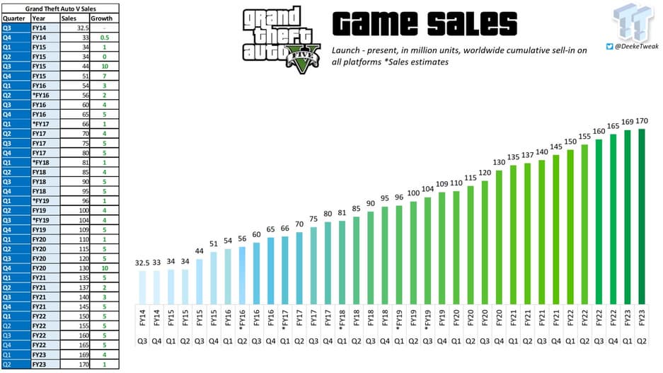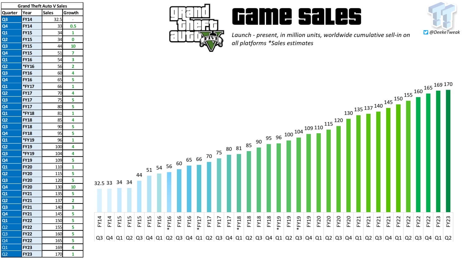 Недавний отчет о доходах Take-Two Interactive за 2 квартал 2023 финансового года подтверждает, что продажи GTA V застопорились. Компания заявила, что GTA V продана в количестве «более 170 миллионов копий» по сравнению с показателем «почти 170 миллионов копий» в первом квартале 2023 года. В течение последних нескольких кварталов GTA V продавалась по 5 миллионов копий в квартал пять кварталов подряд (с 4 квартала 21 года по 3 квартал 22 года). Этот рост начинает замедляться.