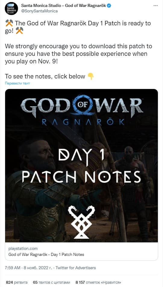 Студия Santa Monica выпустила «патч первого дня» для God of War Ragnarok. Обновление файлов устраняет ряд ошибок, поэтому разработчики рекомендуют загрузить их перед первым запуском игры.