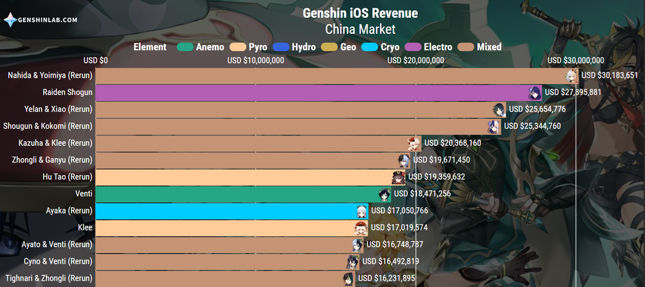 Спустя полторы недели баннеру по-прежнему удаётся демонстрировать высокие результаты. Он заработал более 30.1 миллиона долларов, что стало новым рекордом (удерживала Сёгун Райдэн с 27.8 млн.). При этом учитываются лишь данные игроков на iOS из Китая, но Genshin Impact представлена на ПК, консолях, Android и во многих регионах.