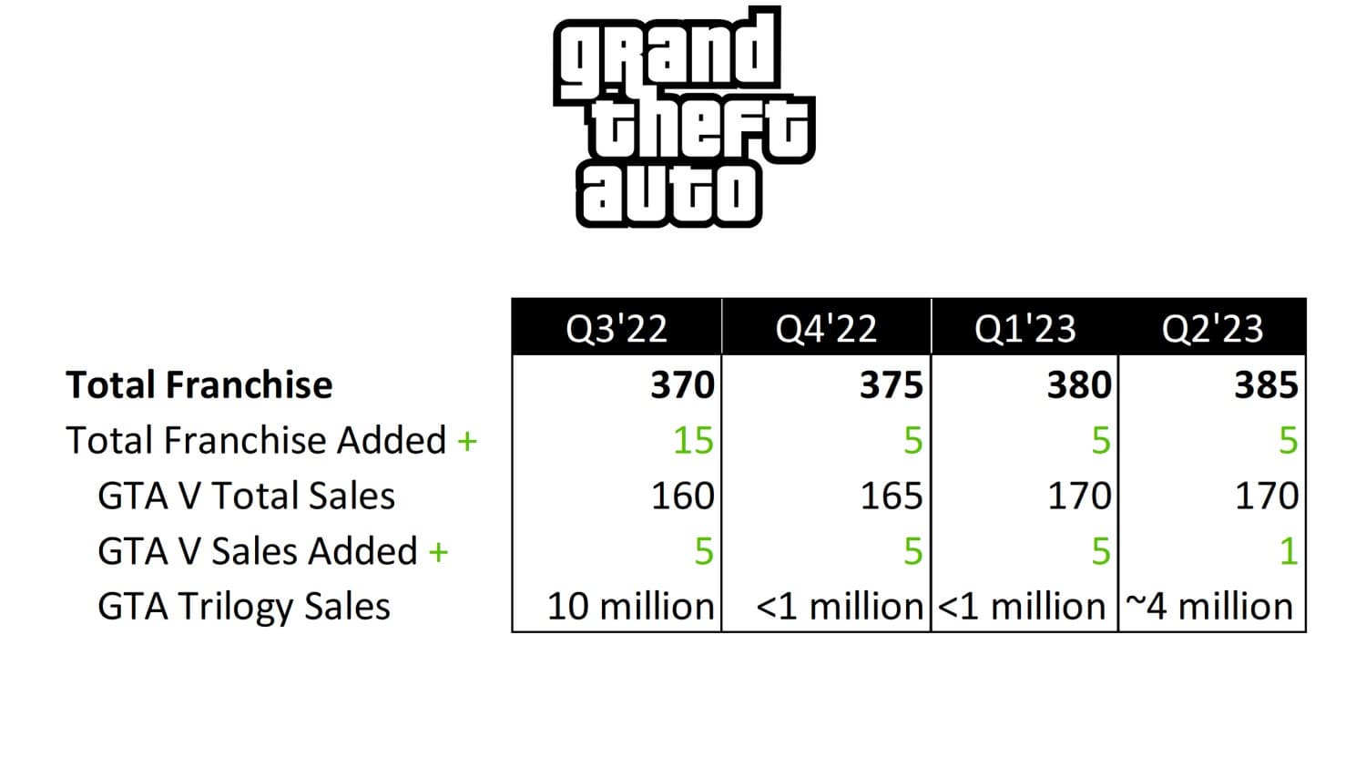 Остается неясным, какие именно игры были проданы. Например, в эту цифру могут быть включены продажи Grand Theft Auto IV на консолях старого поколения и/или ПК. Но, учитывая возраст этих игр, более вероятно, что основной объем продаж приходится на комплект ремастеров трилогии GTA.