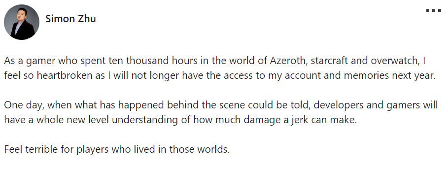 Менеджер NetEase Саймон Жу (Simon Zhu) нелестно высказался в социальной сети об одной персоне. Прямо он не стал называть имя виновного, но пост быстро связали с главой Activision Blizzard Бобби Котиком: «Как геймер, который провел десять тысяч часов в мире Азерота, Starcraft и Overwatch, я чувствую себя таким разбитым, поскольку в следующем году у меня больше не будет доступа к моей учетной записи и воспоминаниям. Однажды, когда можно будет рассказать о том, что произошло за сценой, разработчики и геймеры получат совершенно новое понимание того, какой вред может нанести один придурок. Ужасно жаль игроков, которые жили в этих мирах».