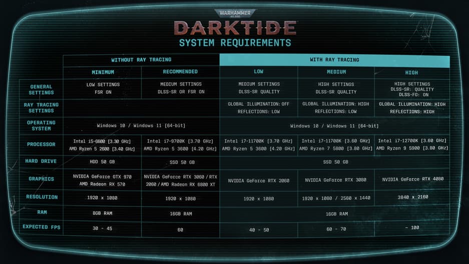 В качестве минимальных системных требований для игры в Warhammer 40,000 Darktide без трассировки лучей на низких настройках с FSR в разрешении 1920х1080 указали: