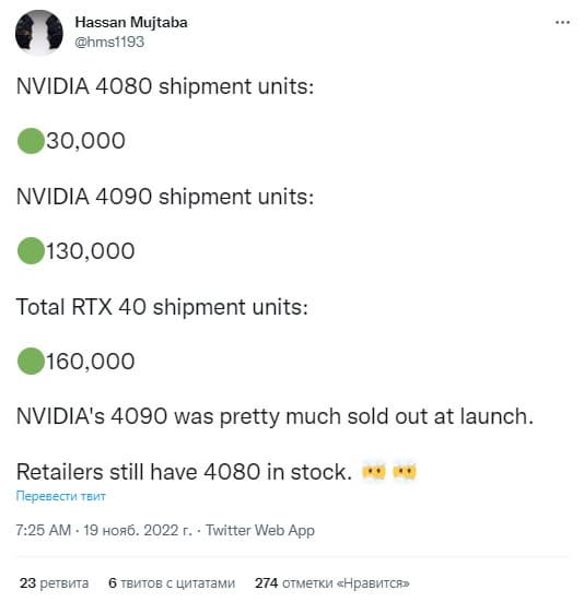 Несмотря на более скромные поставки, GeForce RTX 4080 продается с трудом, а потребители лучше покупают RTX 4090.