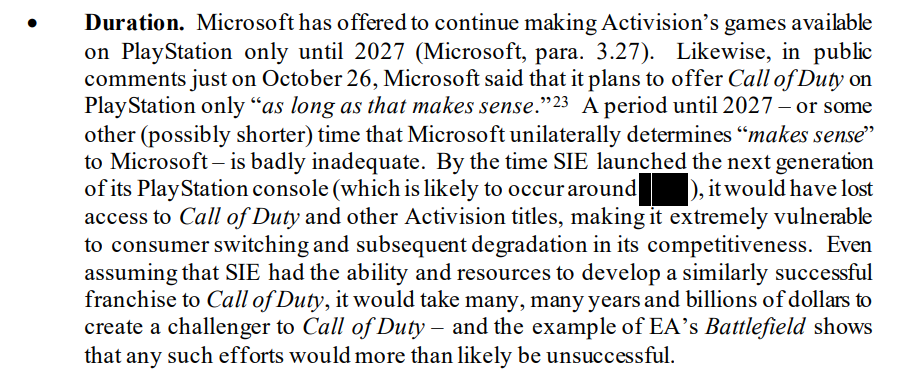 В документе Sony отмечает опасность сделки для самой компании (Sony), а также для всей индустрии. Microsoft может воспользоваться правами на Call of Duty (сделать эксклюзивом) и превратить Xbox в универсальный магазин шутеров.