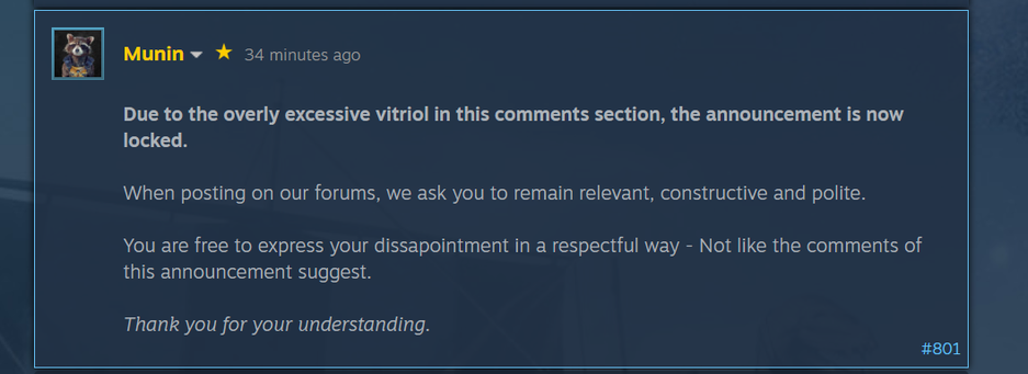 Сообщество Valheim далеко не всегда использовало корректные выражения. Уровень токсичности пересёк черту и было принято решение закрыть комментарии к предложению авторов Valheim о номинации на премию Steam.