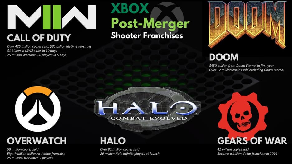 Sony заявила британскому Управлению по конкуренции и рынкам, что Microsoft после слияния с Activision станет обладателем слишком большого количества популярных шутер-франшиз, включая Call of Duty, которая доминирует в сегменте на консолях премиум-класса с доходом более 31 миллиарда долларов. Другие франшизы включают Overwatch, которая стала миллиардной серией в 2017 году, присоединившись к другим мегахитам Xbox, находящимся в собственности компании, таким как Halo.