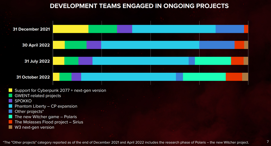 Вот так распределили ресурсы CD Projekt. Большинство разработчиков направили на создание платного дополнения Phantom Liberty для Cyberpunk 2077, которое планируют выпустить в 2023 году. Также многие работают над новой игрой по франшизе The Witcher (Project Polaris).