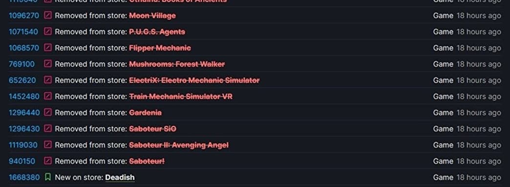 Похоже, странное стечение обстоятельств привлекло внимание самой Valve. И в SteamDB появилась информация о запрете продаж около 20 продуктов, в том числе принадлежащих дочерней компании VRFabric.