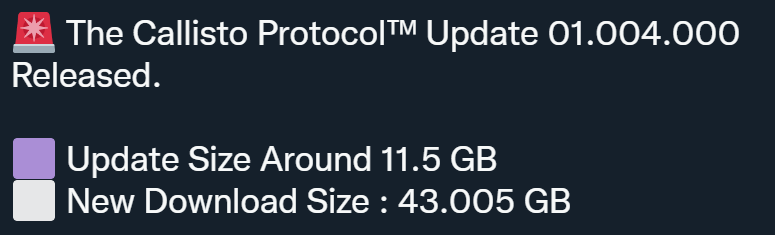 На PlayStation 5 действует система сжатия, а потому игра «весит» поменьше. По данным PlayStation Game Size, The Callisto Protocol потребует порядка 43.005 ГБ. Появилась информация об обновлении 01.004.000 (вес 11.5 ГБ).