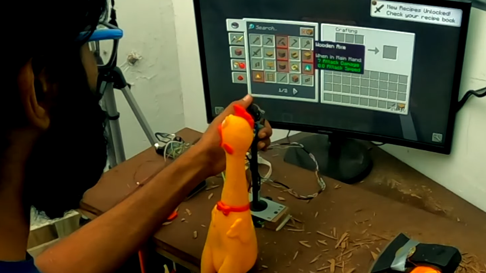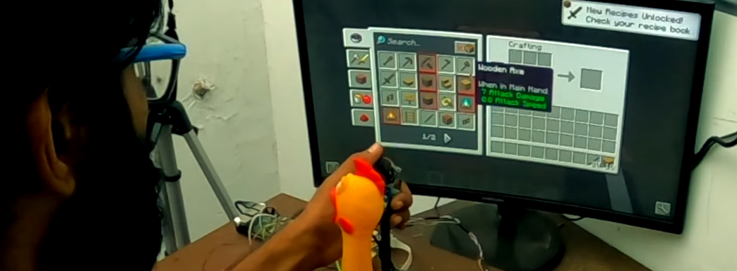 Teenenggr начал размахивать топором и ударять им об доску, а виртуальный топорик начал делать своё дело в Minecraft — рубить деревья, а в какой-то момент и живность. Кирка застревала в дереве и поэтому Teenenggr начал стучать по стене. Добыча ресурсов при таком способе управления не выглядит простой задачей.