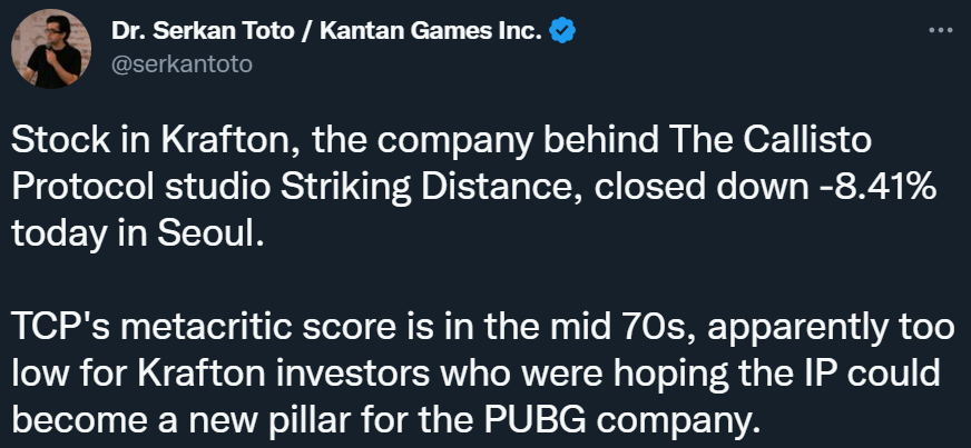 Предполагается, что инвесторы ожидали более высоких оценок The Callisto Protocol. Krafton издаёт PUBG, т.е. у компании есть довольно стабильный источник дохода. Однако, на новый хоррор возлагали определённые надежды, например в портфолио Krafton могла бы появиться новая франшиза.