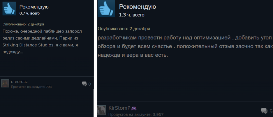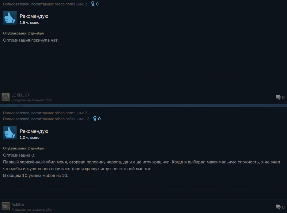 Как оказалось, «отрицательных» обзоров на самом деле даже больше. Дело в том, что в заметной части положительных обзоров пишут про «мёртвую оптимизацию», регулярные вылеты и о том, что «играть невозможно». Порой положительный обзор оставляют заочно.