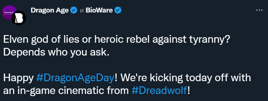 BioWare уточнила, что это внутриигровой (in-game) ролик с историей Соласа (Solas). Игрокам в Dragon Age Dreadwolf предстоит остановить его, поскольку Солас намерен уничтожить мир.
