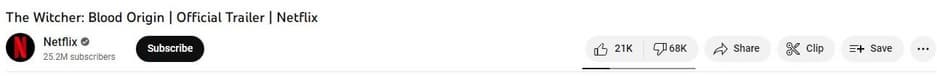 Трейлер сериала «Ведьмак: Происхождение» на момент написания этих строчек заработал 21 тысячу пальцев вверх при 68 тысячах пальцев вниз. Судя по комментариям, зрители уже ненавидят шоу, хотя его премьера состоится только 25 декабря.